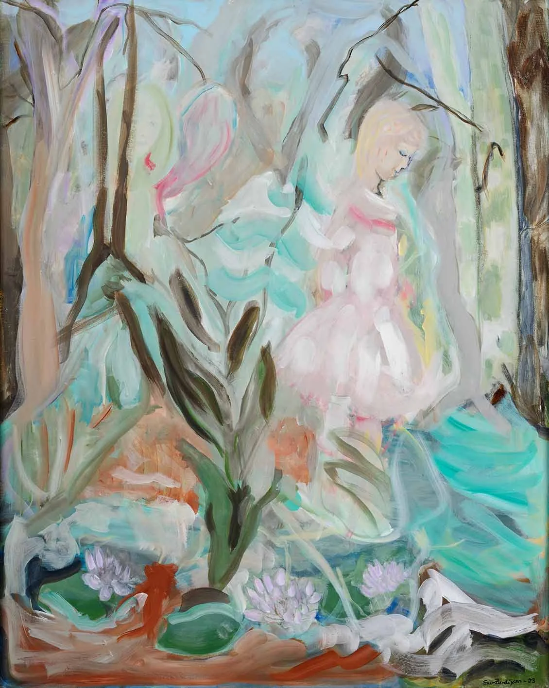 Bildet er malt i duse farger. Natur og kvinnen går i ett med hverandre og reflekterer forbindelse mellom mennesker og natur.